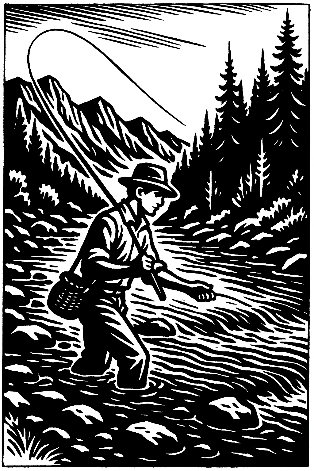 The day stretched thin and long. The sun climbed high, then tilted west. He caught small browns strong, nervous fish and let them go, each one leaving a brief tremor of life in his fingers. Around him, the wind stirred the pines, the smell of resin and cold stone mixing with the smoke from his little fire. He ate jerky and a heel of bread.